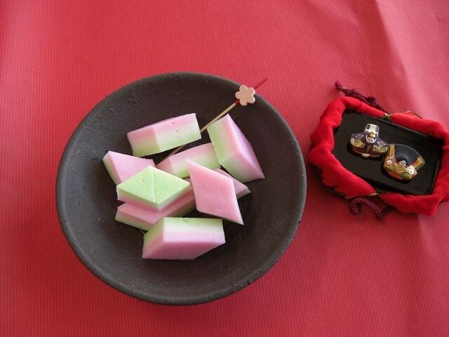 天草の魚をふんだんに用いて、ピンク、白、緑のすり身を重ねて作るかまぼこです。ピンクは「桃」、白は「雪」、緑は「萌える若草」を表し、雪の下には緑が芽吹き、溶けだした雪の上には桃の花が咲いている様子です。また、ピンクは桃にまつわることから「魔除け・厄払い」、白は純白の雪から「清浄」、緑は芽吹く若草の生命力から「健康や長寿」の意味が込められています。ちなみに、ひし形をしているのは「大地」や「心臓」を象徴しているとも。